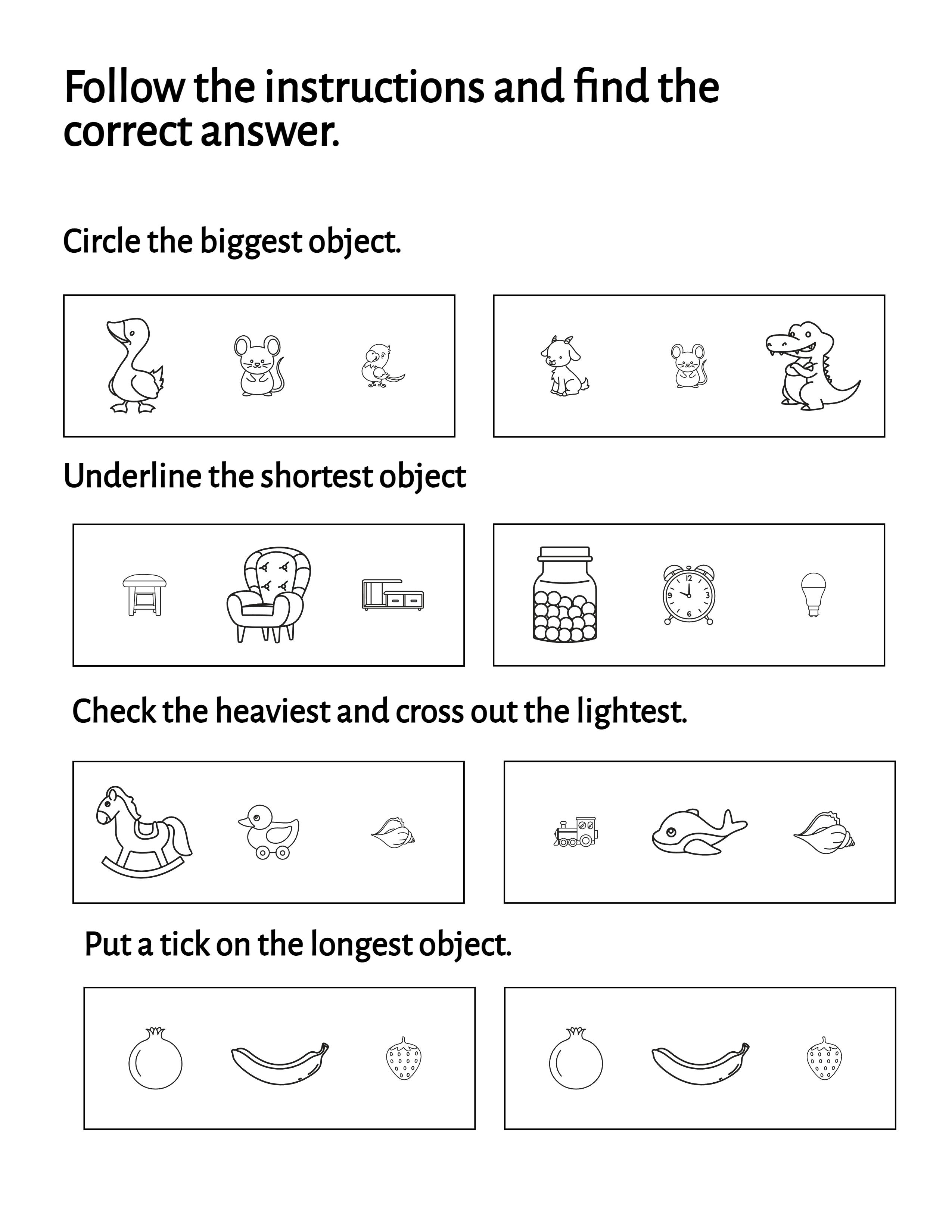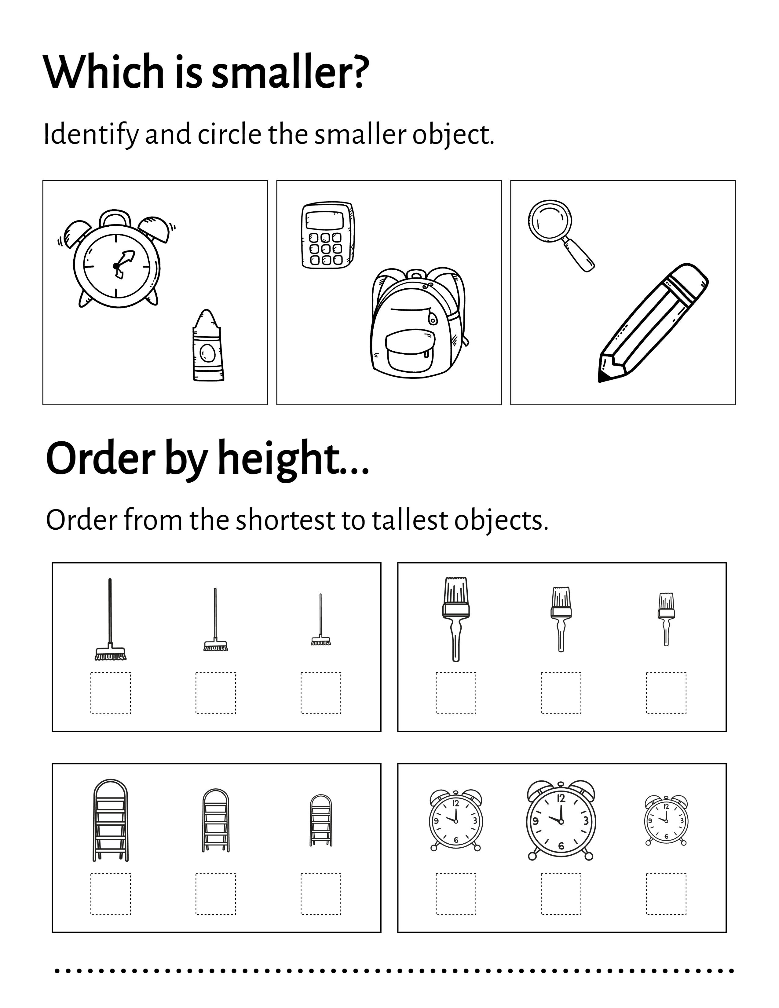 Create worksheets for length, weight, volume, and size comparisons. Choose from different activity types and difficulty levels. Perfect for early learners and math workbooks.