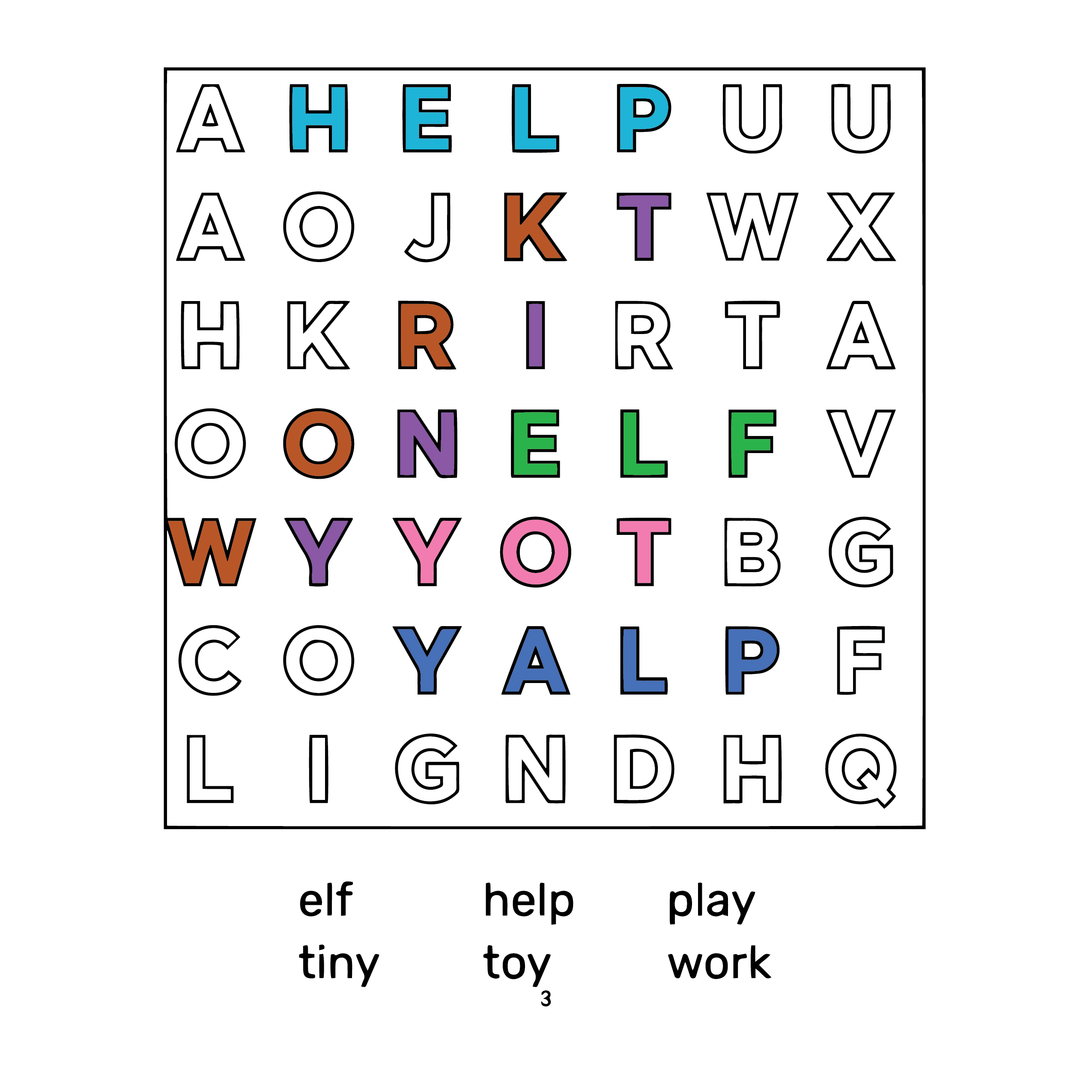 Combine coloring and word search in one puzzle. Users find and color the words. Choose your word list and difficulty. Great for relaxing activity books for kids or adults.